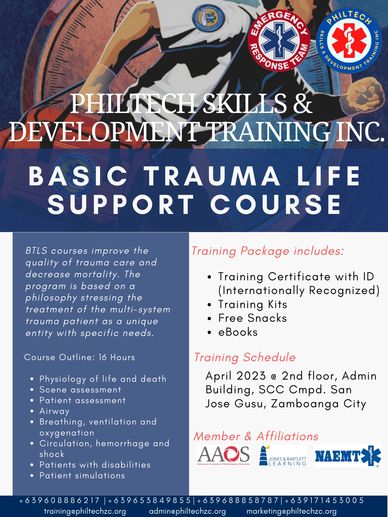 Basic Trauma Life Support is an advance skills and knowledge for EMTs, Nurses and Paramedics with the use of specialized equipment and updated guidelines on Trauma Life Support.