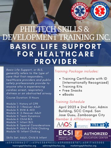 PHILTECH Skills & Training Development Inc. offers Basic Life Support for Lay Rescuer and Healthcare Provider with the use of AED.
