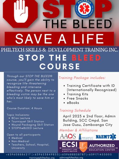PHILTECH Skills & Training Development Inc. offers Emergency First Aid with STOP the Bleed Training Program, Occupational First Aid / Basic Life Support with AED, Standard First Aid Training with Basic Life Support - CPR.